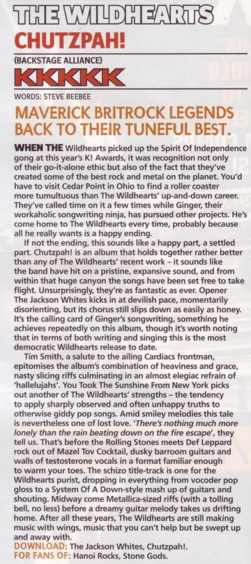 With the release of new album Chutzpah! just over a week away now, more reviews are rolling in. Kerrang! magazine have awarded the album 5K’s concluding that ‘After all these years, The Wildhearts are still making music with wings, music that you can’t help but be swept up and away with.’ Click on the review to the right to see the full review.